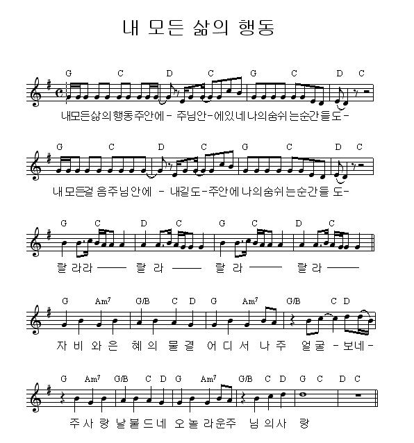 내 모든 삶의 행동 어노인팅 악보. 나나나 나나나나 x4 내 모든 삶의 행동 주안에 주님 안에 있네 x2 나의 숨쉬는 순간들도 자비와 은혜의 물결. B part 나나나 나나나나. 내 모든 삶의 걸음 주안에 내길도 주안에. 라 라라라 라라 라 라라라 라라 라 라라라 라라 라 라라라 라라 자비와 은혜의 물결 어디서나 주 얼굴 보네.