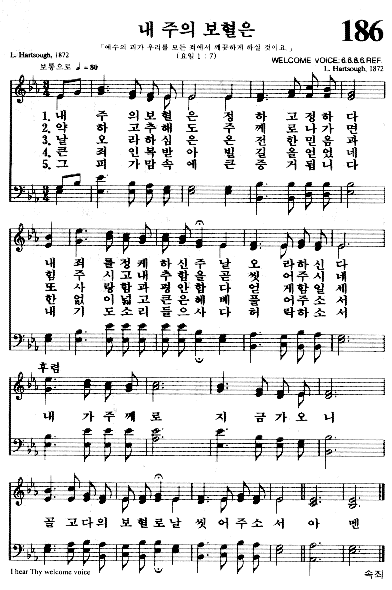 내 주의 보혈은 i hear thy welcome voice 정하고 정하다 that calls me lord to thee 내 죄를 정케하신 주 for cleansing in thy pre. 영어찬송 i hear thy welcome voice 내 주의 보혈은 1. 약하고 추해도 주께로 나가면 힘 주시고 내 추함을 곧 씻어 주시네. 1 내 주의 보혈은 정하고 정하다 내 죄를 정케하신 주 날 오라하신다.