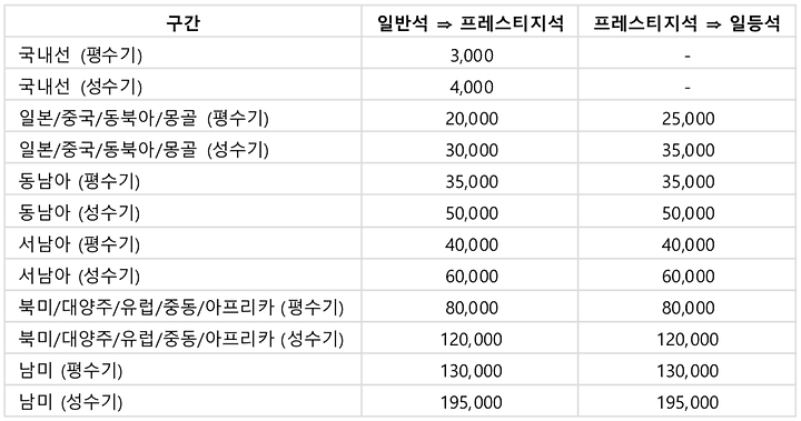 대한항공 마일리지 공제표 좌석 승급 업그레이드 대한항공 연구소