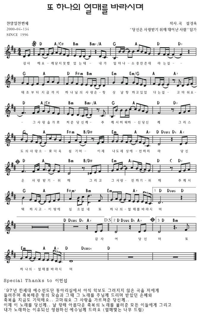 Ccm악보 또 하나의 열매를 바라시며 감사해요 깨닫지 못했었는데 설경욱 조수아 3집 D키 네이버 블로그