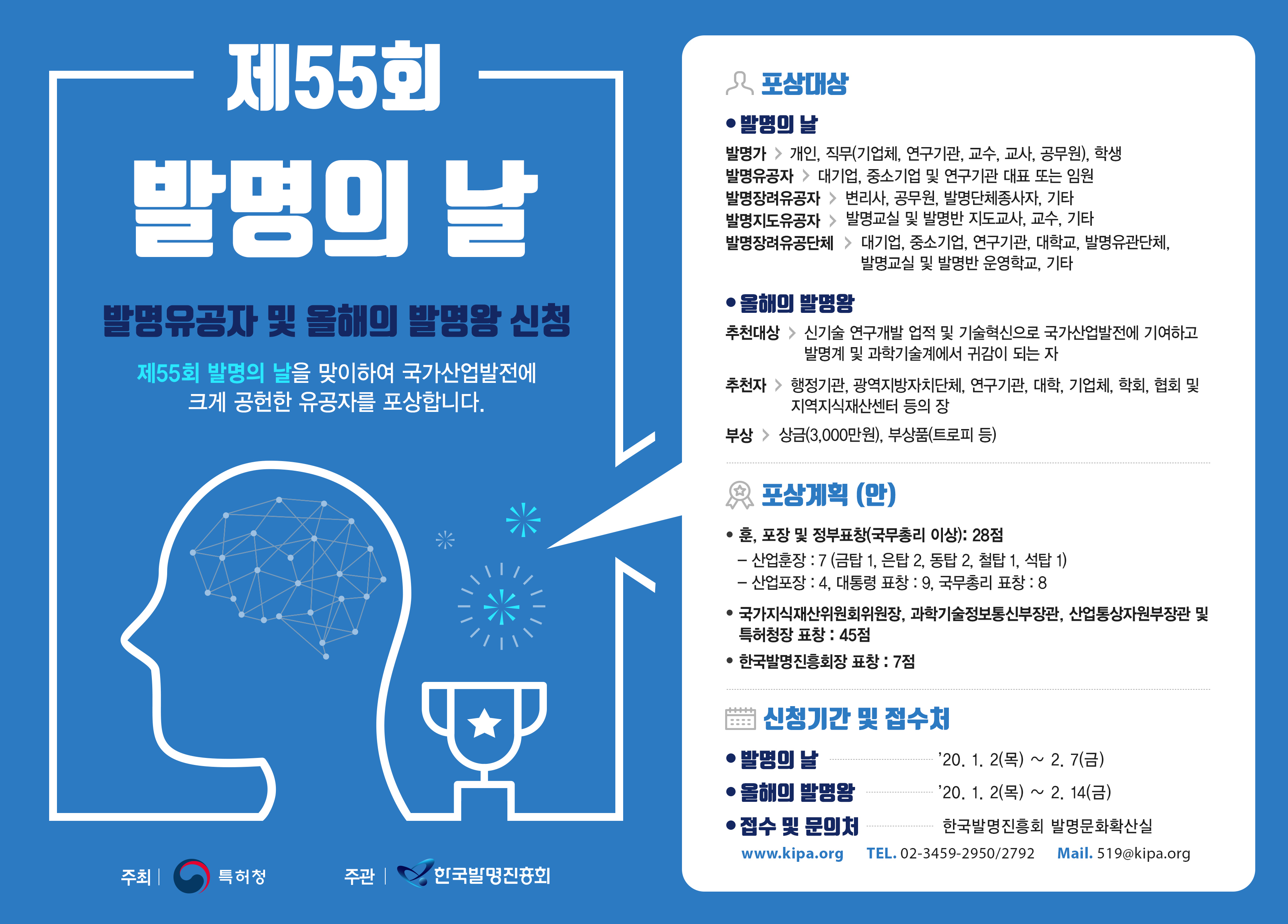 공통 2020년 올해의 발명왕 선발 신청 접수 및 제55회 발명의 날 포상 계획 공고 전체소식 알림 소식 콘텐츠산업정보포털