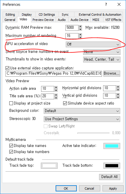 베가스 프로 렌더링 중에 멈춰버리는 경우 해결 방법 Gpu Acceleration Processing 사용설명서