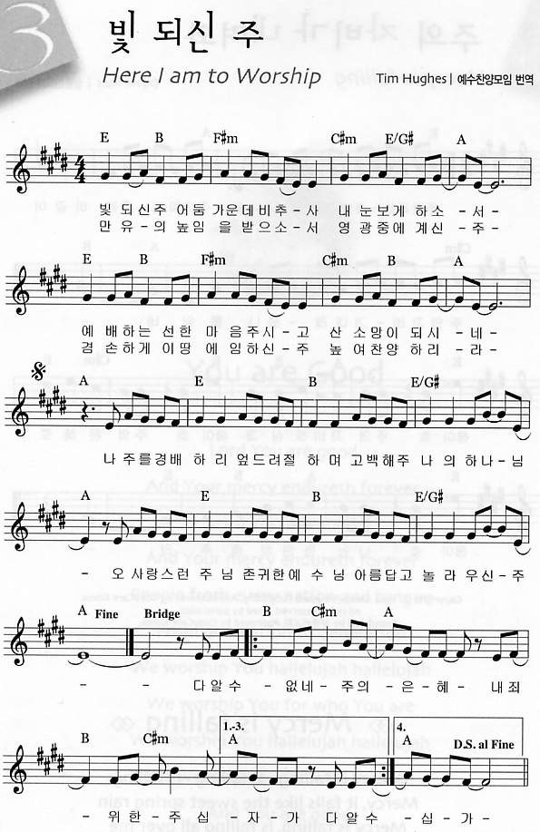 한글 영어 찬양 악보 빛 되신 주 Here I Am To Worship E키 네이버 블로그