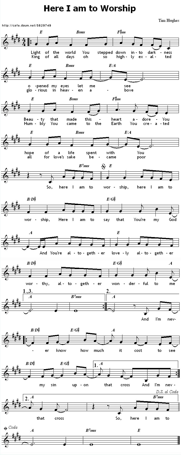 영어 Ccm 찬양 Here I Am To Worship 악보 가사 네이버 블로그