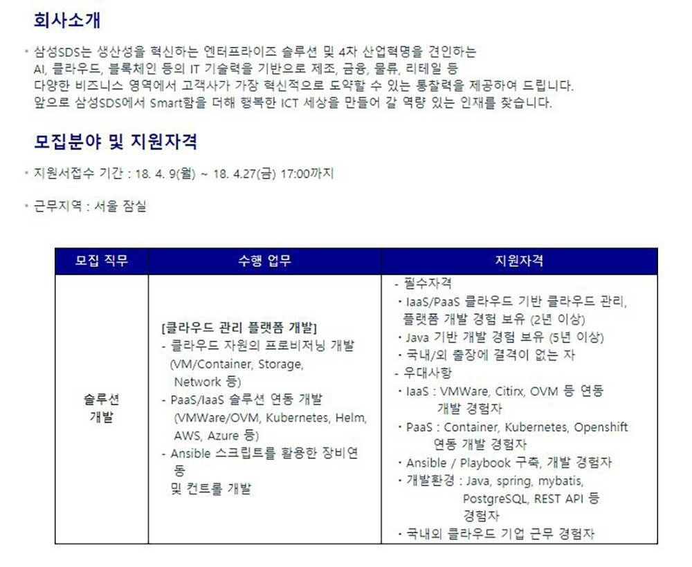 삼성sds 주 2018년 상반기 3급 신입사원 채용 공고 마감일 03 20 이공계취업 이엔지잡