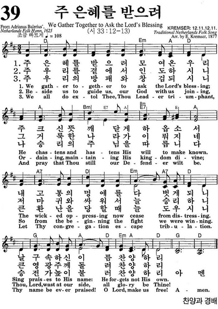 在 영어 찬송 39장 주 은혜를 받으려 We Gather Together To Ask The Lord S Blessing 在 영어찬양가사만 해석 영어찬송