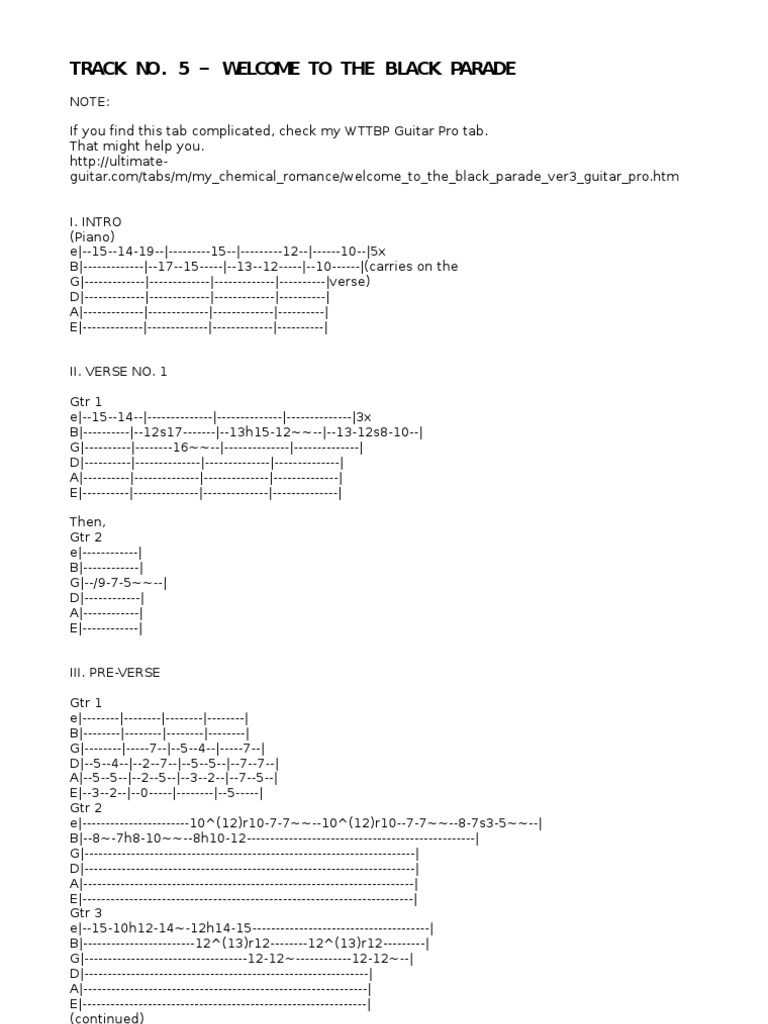 Welcome To The Black Parade My Chemical Romance Guitar Tab Of Piano Melody Guitar Tabs My Chemical Romance Guitar